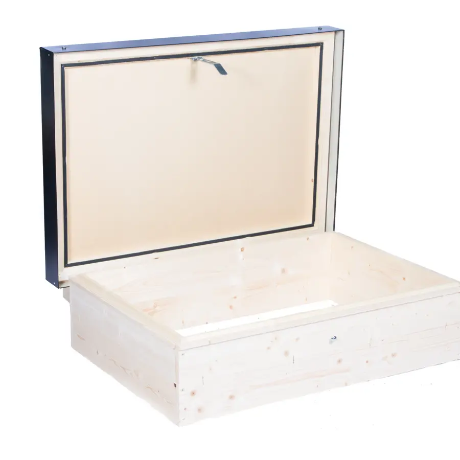 KlarVent- Trä Uppstigning är en uppstiningslucka med invändig öppning. Uppstigningsluckan har ett svart isoelrat lock som standard och tillverkas med 230mm eller 300mm hög sarg. Stndard storlekar är 600 x 900mm, 700 x 900mm eller 1000 x 1000mm. Lucka kan fås med olika tillval med olika RAL Kulörer på lock eller gastrycksfjädrar för lättare öppning & Stägning. Special storlekar kan tillverkas eftre behov.